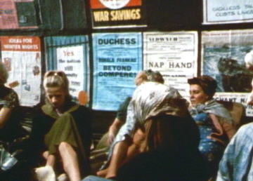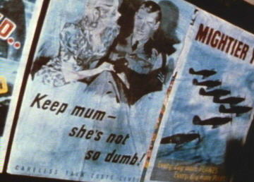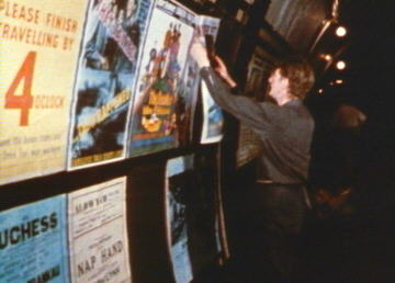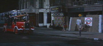 | The raw un-cropped fooatge for the opening shot of the station exterior shows more detail of the upper parts of the buildings. | On the platform, contemporary 1960s posters - including the quad for the Beatles' Yellow Submarine film - are covered with 1940s advertising. | ||||||
