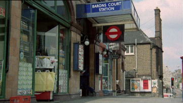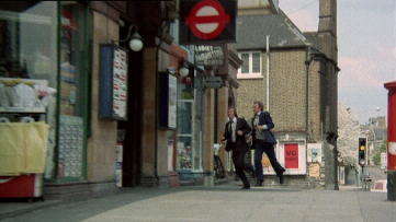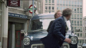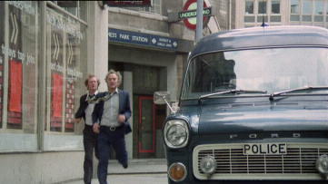 | "You're nicked!" "You slaaag!!" "Shat-it!!!" The morning after a booze-soaked night, Regan (Jon Thaw) and Carter (Dennis Waterman) find themselves late for work. With no offiicial transport, they take a train (presumably District line) from Baron's Court and exit at the Palmer Street exit of "St James's Park" station, close to Scotland Yard. [With thanks to Julian Knott] |