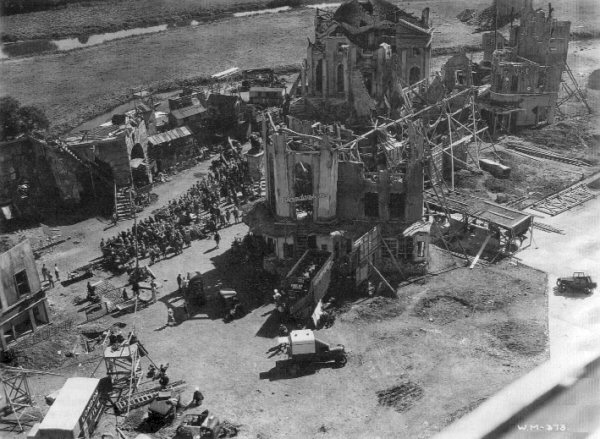 In parallel with the "complete" version of Everytown, the set was duplicated to the left (i.e. east) in semi-ruined form for the 1966-1970 scenes, as can be seen below. Note the river on the left, very close to the back of the buildings, with the lake beyond. See the Post Production gallery for a illustration of how the two sets stood side-by-side. For orientation purposes, the tallest of the equivalent part-constructed buildings to the right-centre in the post-gale view is the same as see in the centre here ("Sandersons" department store - note the tall first floor windows), except that the point of view is some 45° counter-clockwise (approximately south-east). Just above the small van in the centre foreground, a open-topped doubledecker bus is parked at right-angles to the Sandersons building. This is not, however, the bus seen in the market scenes, which is in another part of the set. At the top of the rear external staircase is a sign reading "FIRST AID STATION" indicating its working use. Almost completely obscured by the shadow from the Sandersons buolding is an incongruous telephone kiosk, which is just visible being used as a sentry box at the start of the 1970 segment.