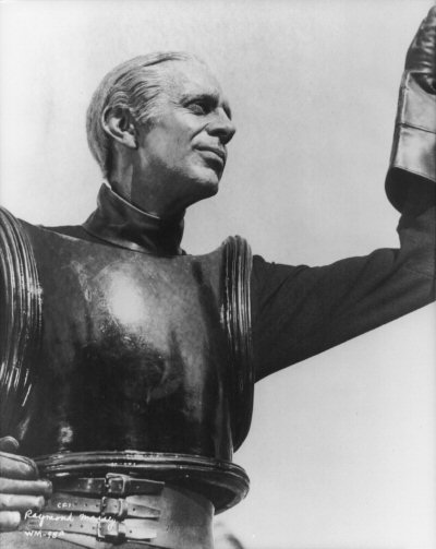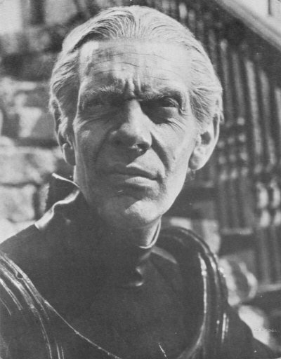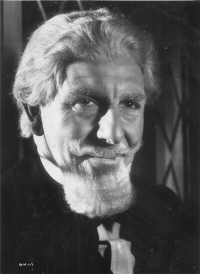 Amazingly, one of the biggest casualties in terms of lost footage is the event that drives the narrative in the last part of the film, namely Theotocopulos's speech to the world. In the Standard Print, it seems that he makes a few disjointed arguments, and suddenly the entire population rebels! The Stover Script does have more of this speech, although since it retains the timescale of the Standard Print, events still seem to progress to near-anarchy far too quickly. It is only in the Film Story that the disgruntled sculptor gets to argue his full case in a speech more than ten times longer than what survives now, while having it take place in the narrative considerably earlier, allowing times for the discontent to fester and grow into open revolt. The speech is also intercut with reactions from various members of the 2036 population - either for or against his arguments - and the few reaction shots of viewers that survive hardly do justice to the initial premise. One reason for the radical re-working of this part of the film may lie in the fact that Cedric Hardwicke was not actually the original choice for Theotocopulos. The Film Treatment describes him thus: "a tall, slender man, bearded... like one of the figures in a picture by his ancestor [Doménikos Theotokópoulos] El Greco." In fact, all of Theotocopulos' scenes were initially shot with Ernest (Bride of Frankenstein) Thesiger in the role, but these were discarded because (ironically!) Wells was supposedly dissatisfied with the actor's voice. Nobody bothered to tell Thesiger this, and he actually turned up at the premiere in the full belief that he was still in the film, although he did successfully appear in its companion piece, The Man Who Could Work Miracles, the following year. Some long-shots of the crowd approaching the Space Gun seemsto show Thesiger, rather than Hardwicke, who only appears in these scenes in close-ups of him surrounded by a tight knot of his followers. This portrait of Thesiger shows how radically different his severe costume was from Hardwicke's flowing robes.