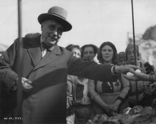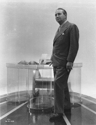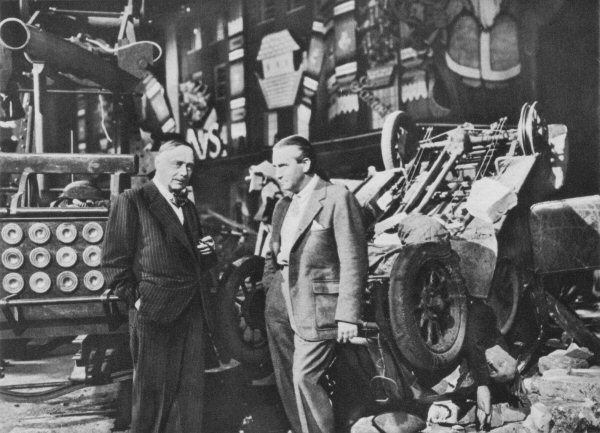 H.G. Wells with Menzies on the complete set at Denham during the filming of the air raid sequence. On the left, behind Wells, is one of the ainti-aircraft guns, the circular items being the bases of its shells.