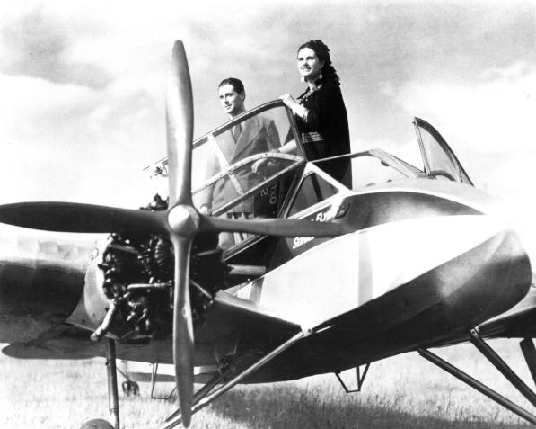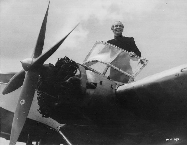 Raymond Massey in costme in a General Aircraft Monospar ST-4, operated by Oxford Flying Services, which according to the 11 July 1935 issue of Flight magazine was based at Chilworth Aerodrome, near Wheatley, Oxfordshire. This was probably taken before leaving for or arriving at Brooklands Aerodrome, which was used for the base of the Boss's "air force," as well as where John Cabal returns to Everytown.