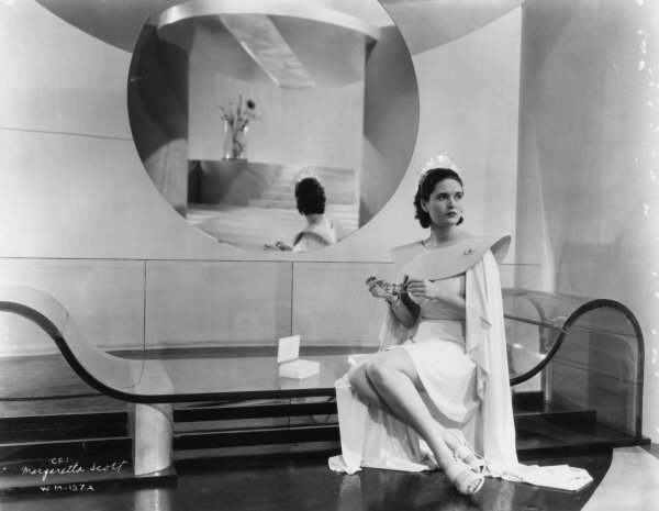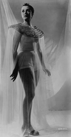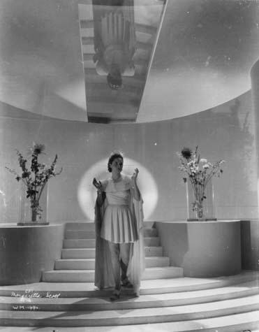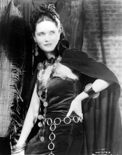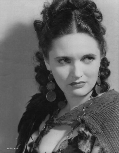 A striking portrait of Margaretta Scott as Roxana Black, the Everytown Boss's mistress. Only in this very detailed photograph can it be seen that her ear-rings and necklace are actually made from 1930s British coins! This was the basis for the colour artwork of Scott on the "My Favourite Part" cigarette card produced by Gallaher.