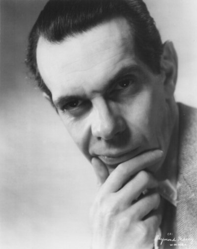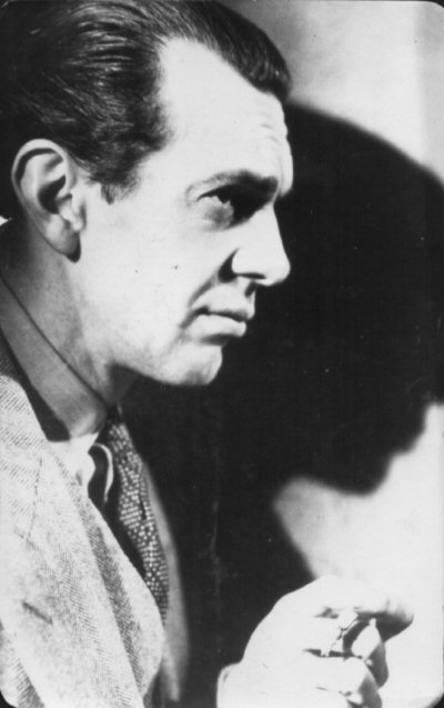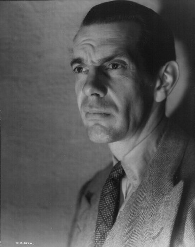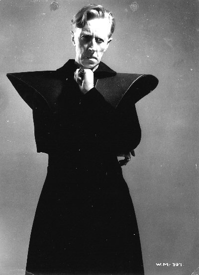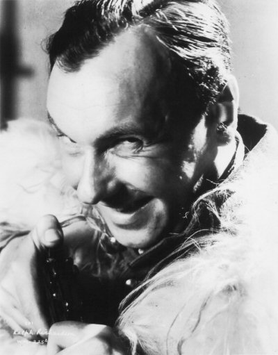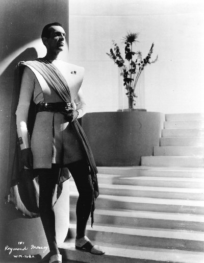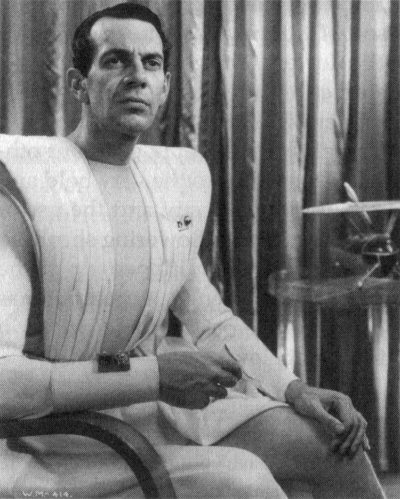 Massey as Oswald Cabal. This was the basis for the colour artwork of Massey on the "My Favourite Part" cigarette card produced by Gallaher, but note the model aircraft on the table in the background of this original wider view. This image was also used on a promotional postcard for the 1936 Ideal Home Exhibition, which included a display of some of the futuristic furniture props from the film.