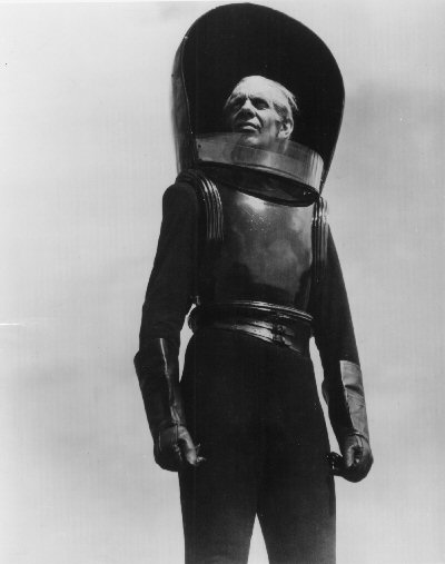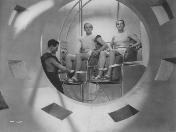 In this screen-grab from the extant footage, they are intially seen being strapped into loose harnesses, as per Wells's script. Note the position of the central periscope-like device.