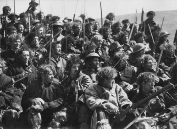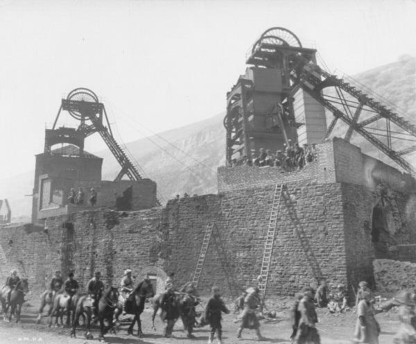 The attack on "the Hill People" by the Boss's brigand army was shot at South Griffin Colliery , Blaina, South Wales between 20 and 23 May 1935, where - according to captioning originally supplied with the first still below - "Unemployed miners as film actors represent the devastated army after the World War." The colliery had been closed since 1921, and was derelict at the time. Two hundred ex-servicemen and Territorial Army members were used in the filming at three hours notice, and at 16 shillings a day (equivalent to £160 today, based on average earnings), providing a much-needed boost of around £1,000 (£200,000) into the local economy.