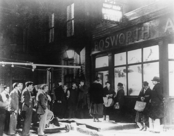 This public house is seen briefly in the 1940 Christmas Eve montage, and was almost certainly shot at Worton Hall Studios in early 1935, rather than being part of the Everytown set at Denham. Director William Cameron Menzies is standing with one leg up on the boom microphone trolley at left, directly behind him is set designer Vincent Korda, and behind him is producer Alexander Korda.