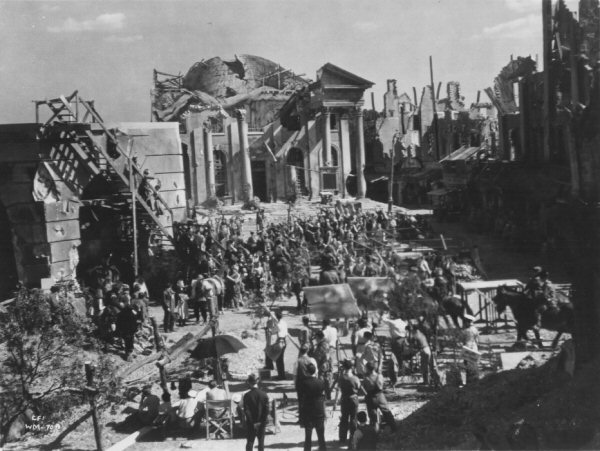 This next viewpoint -isapproximately 20 degrees to the left of the previous one, and almost at ground level, with the building with the rough external staircase on the left being the same as that seen in the top-left quadrant of the previous view; note also the ruined Town Hall with its collapsed dome. From the position of the shadows, this seems to have been taken at a later time in the day than the previous view, while the similar crowd of extras suggest it is the same scene in which the Boss is introduced to Mary (they and Gordon are just visible below the staircase).