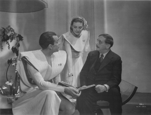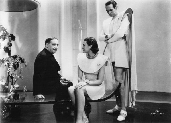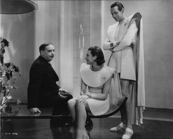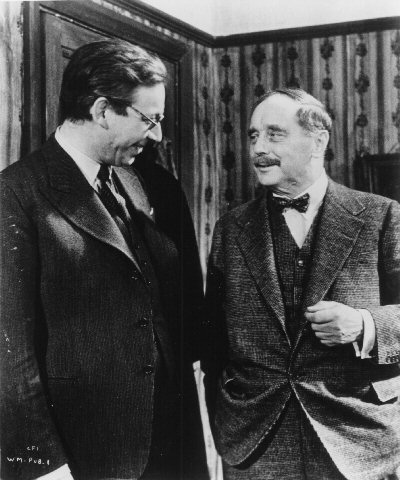 Raymond Massey, Pearl Argyle, and H.G. Wells. This and the following four photographs appear to have been taken at the same time.
