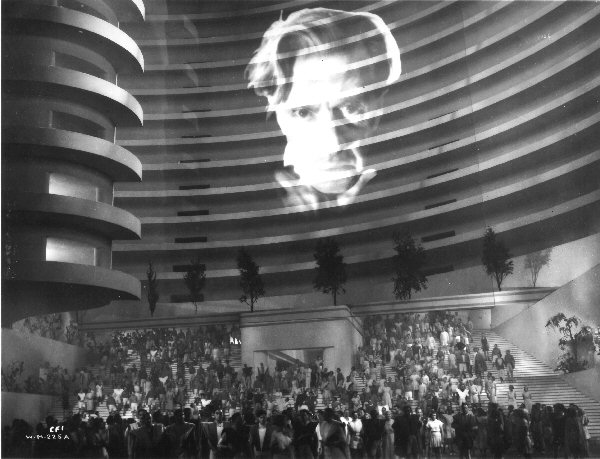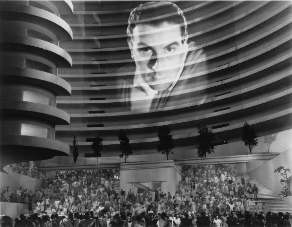 This publicity photograph shows a suitably sour-faced Thesiger on the large screen in the Square of the Everytown of 2036. It was used by some contemporary media sources, despite the re-casting, and has even appeared on the packaging of some video releases.