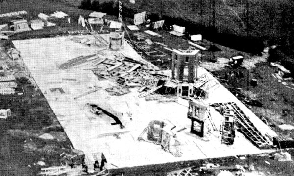 On Friday 7 June 1935, a summer gale which caused widespread damage across southern England wrecked part of the massive Everytown back-lot, then being constructed on land to the north of what was to become Denham Studios. One workman - Arthur Vailes, of Hounslow - was killed, and several others injured. This aerial photograph - which could easily be mistaken for a model - appeared in the next day's edition of the Daily Mirror, and shows the part of the set which would represent the "complete" pre-war version of the town. The view is approximately south.