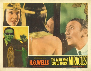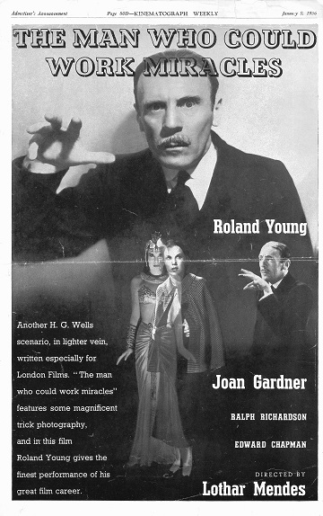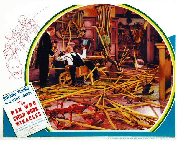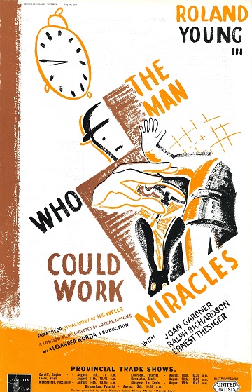 Compared to Things to Come, the production of The Man Who Could Work Miracles was much less troubled, but producer Alexander Korda was not totally happy with it, so it was initially shelved, pending the completion of TTC. Once TTC had been released, Korda returned to TMWCWM, directing re-shoots of certain scenes himself, and it premiered in Southend on 4 July 1936. Unlike TTC, the version of TMWCWM that survives to this day is essentially the same as first released. Note that just at the production stills for TTC are coded "WM" for the working title of Whither Mankind?, those for TMWCWM are coded "MM" as it was originally to be called Miracle Maker.