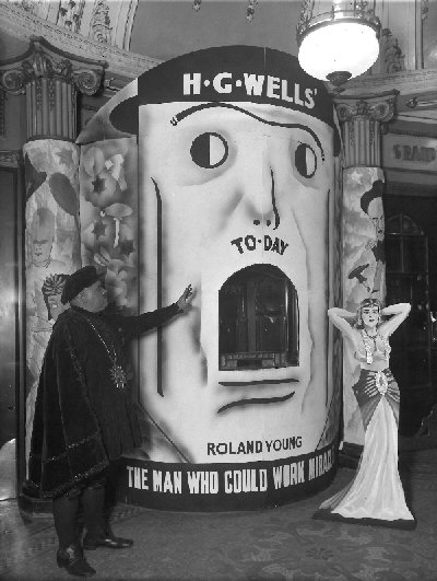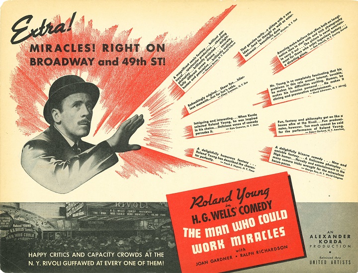 Double-bill Re-Issue Poster27" x 41" (685mm x 1045mm) poster used to advertise a double-bill of Things to Come and The Man Who Could Work Miracles. Undated and with no distributor's name, this is certainly later than the 1947 Film Classics and 1948 British Lion re-issues, since it cribs certain elements from the publicity material of both. Touting Miracles as "uncensored" is a bit cheeky. [Original in the author's collection]