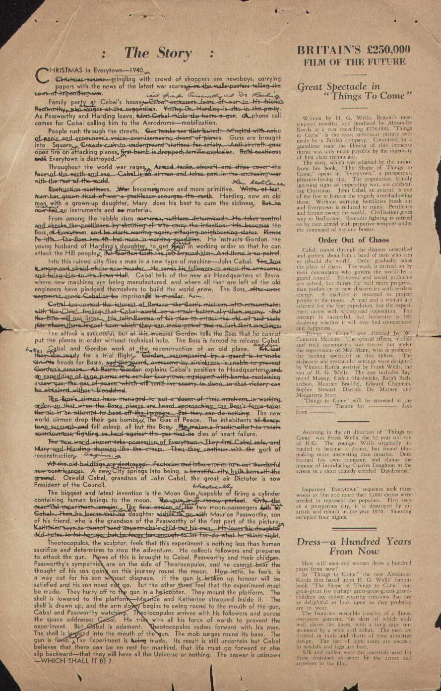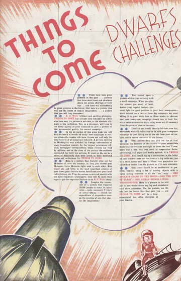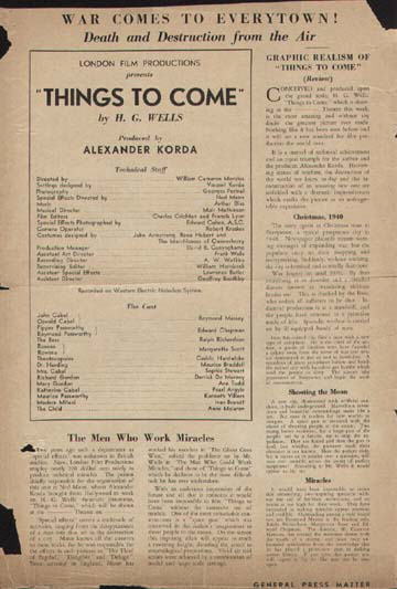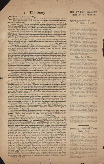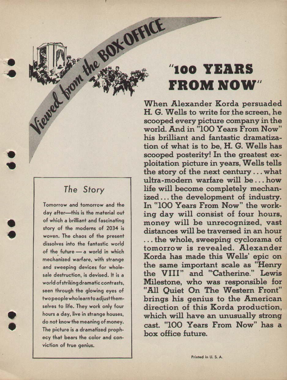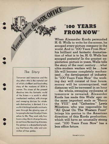 1934 Promotional MaterialThese two sheets of single-sided paper represent the early industry publicity material, dating from early 1934. Notably, it bears the short-lived title of 100 Years From Now, and names Lewis Milestone - who had earlier made All Quiet on the Western Front - as director. The described plot promises: "... a brilliant and fascinating story of the moderns of 2034 is woven. The chaos of the present dissolves into the futuristic world of the future - a world in which mechanized warfare, with strange and sweeping devices for wholesale destruction, is devised. It is a world of striking contrasts, seen through the glowing eyes of two people who learn to adjust themselves to life. They work four hours a day, live in strange houses, do not know the meaning of money... vast distances will be traversed in an hour... the whole, sweeping cyclorama of tomorrow is revealed." [Originals in the author's collection]