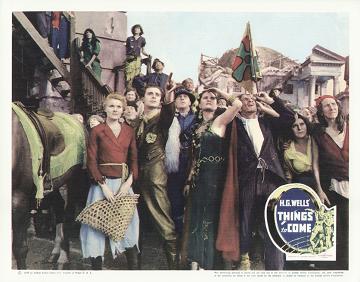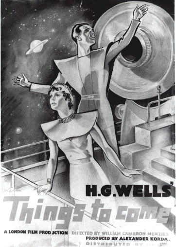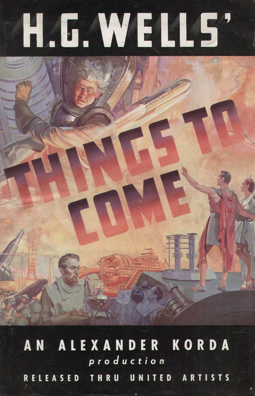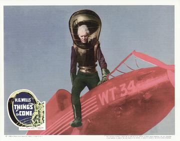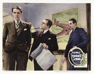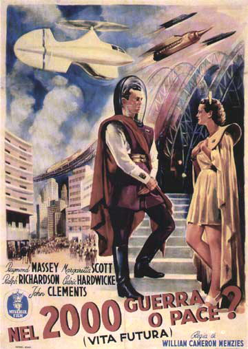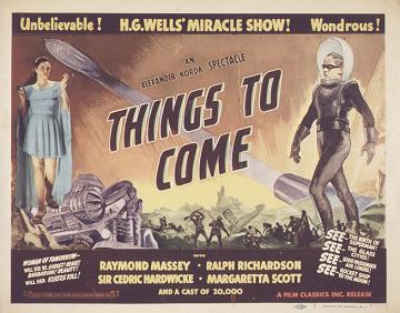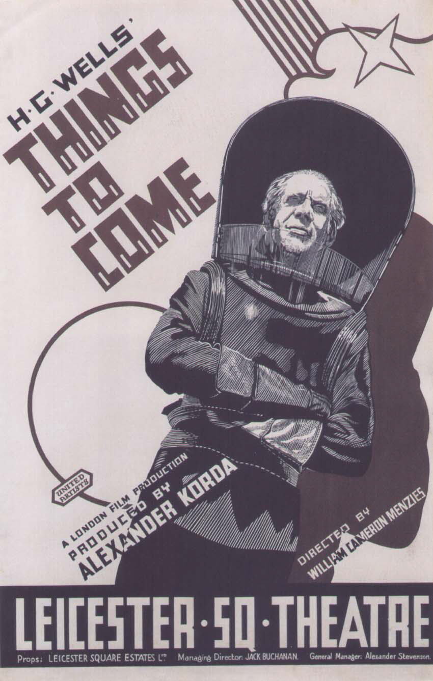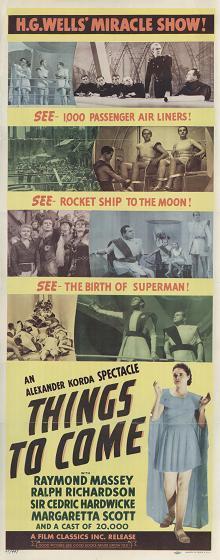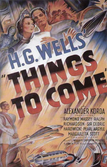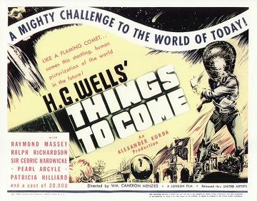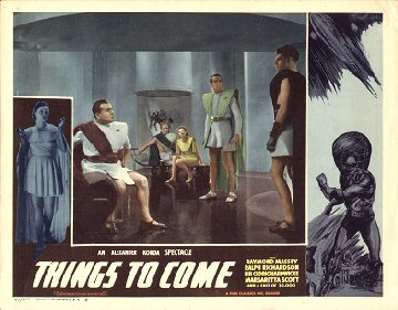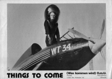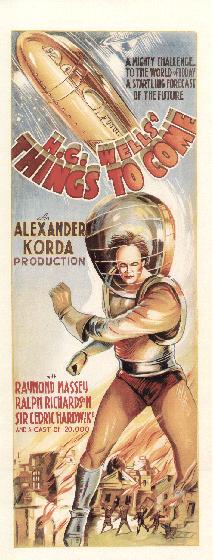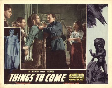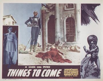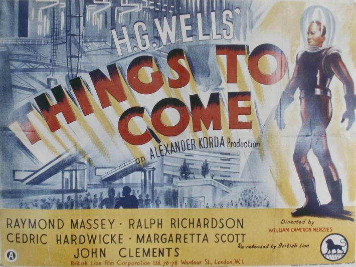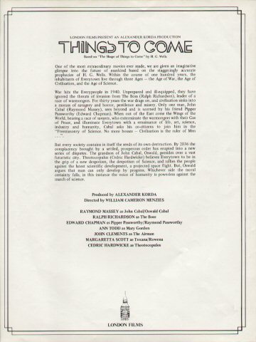 1948 British Lion Re-issue PosterBritish "quad" poster used to advertise the 1948 re-issue by Korda's British Lion Films, reputedly reproduced from a studio proof. After the leads - i.e. Massey, Richardson, Hardwicke and Scott, - John Clements receives fifth billing, despite his minimal (and originally uncredited) role as the German pilot shot down by Cabal in 1940. Things to Come was only Clement's fourth film, but by 1948 he was more well-known. [Large photographic reproduction in the author's collection (formerly FJA collection)]