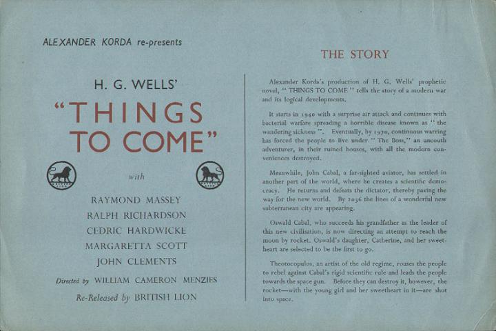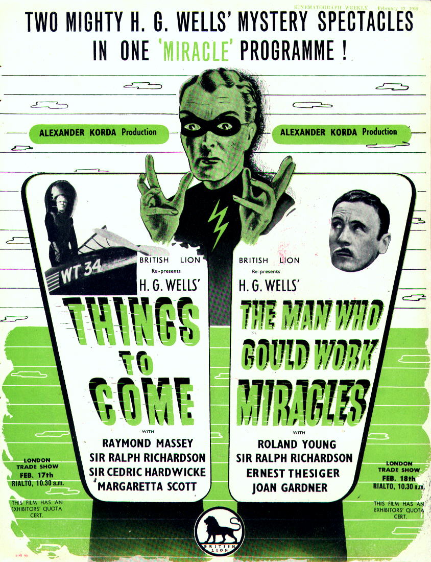 1948 British Lion Re-issue Trade AdvertAdvert from the industry magazine Kinematograph Weekly of 12 February 1948 for trade shows of Things to Come and The Man Who Could Work Miracles, re-issued by British Lion, at 10.30 am at the Rialto, London, on 17 & 18 February 1948 respectively. The British Lion Film Corporation was a small-scale film renting organisation formed in November 1927, in which Alexander Korda bought a controlling interest in January 1946, at the same time he resurrected London Films as a private company, with all but 2% of the shares being held within his family (the London Films that made Things to Come ten years previous was partly owned by the Prudential Insurance Company). Both these ventures provided Korda with not only the means to produces new films, but also to continue to earn a direct profit from his older ones. [Original in the author's collection]
