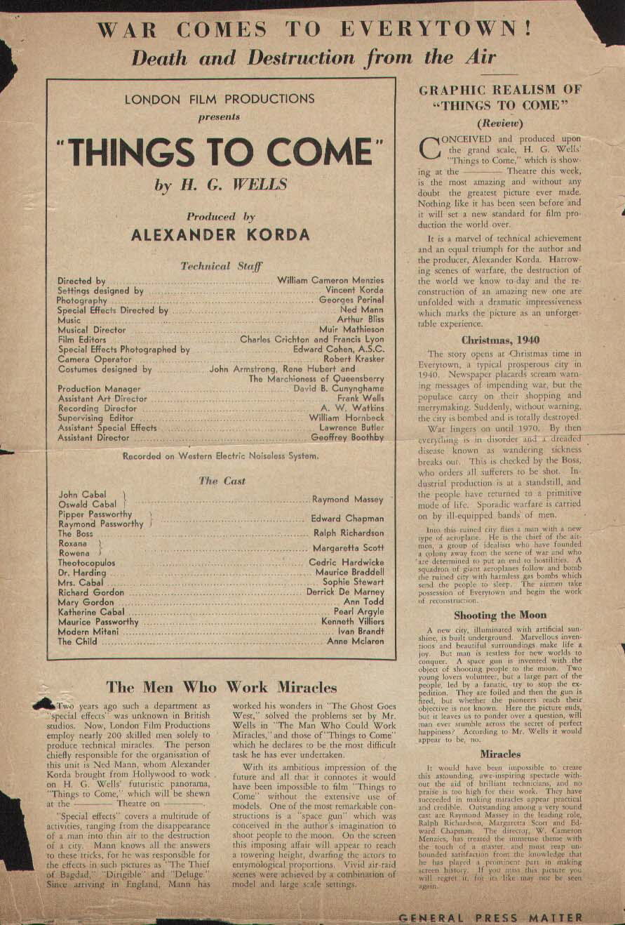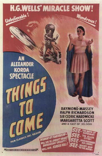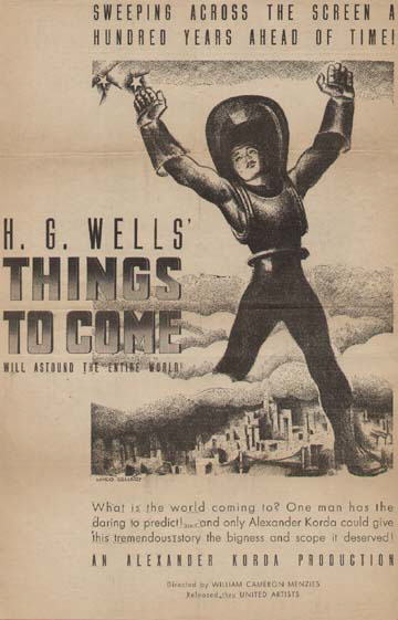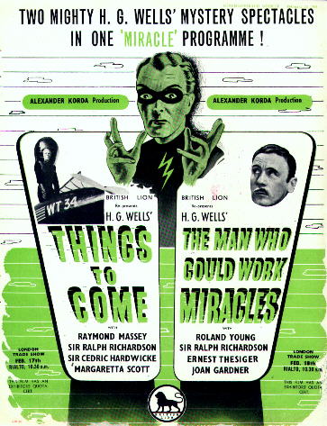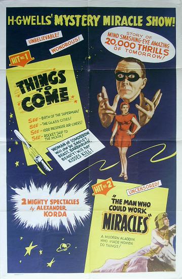 Double-bill re-issue Poster27" x 41" (685mm x 1045mm) poster used to advertise a double-bill of Things to Come and The Man Who Could Work Miracles. Undated and with no distributor's name, this is certainly later than the 1947 Film Classics and 1948 British Lion re-issues, since it cribs certain elements from the publicity material of both. Touting Miracles as "uncensored" is a bit cheeky. [Original in the author's collection]