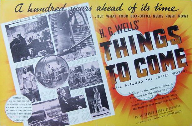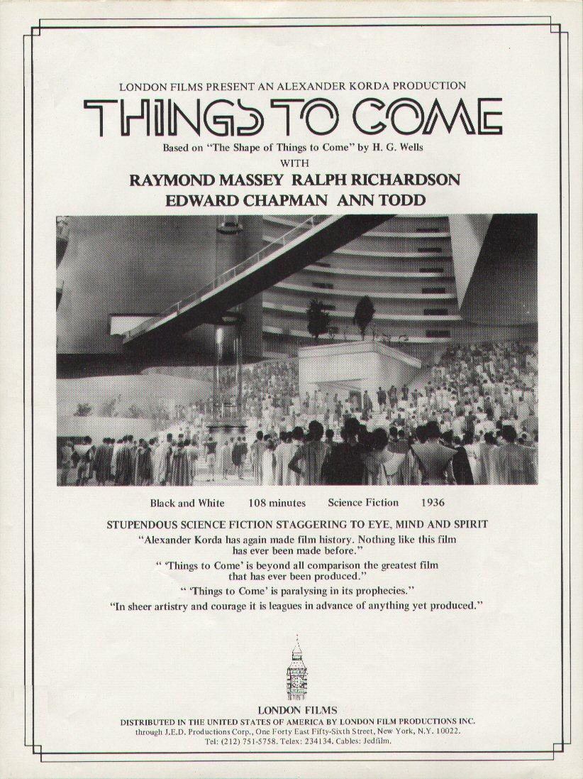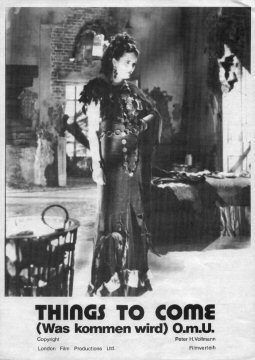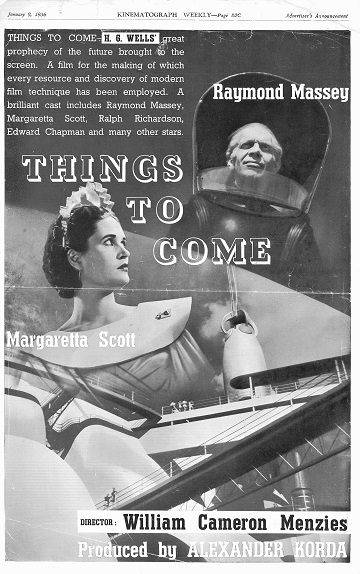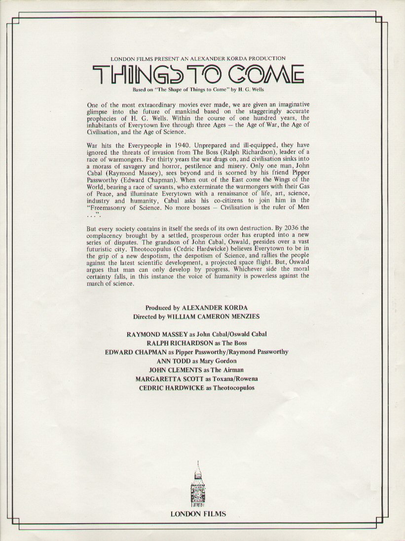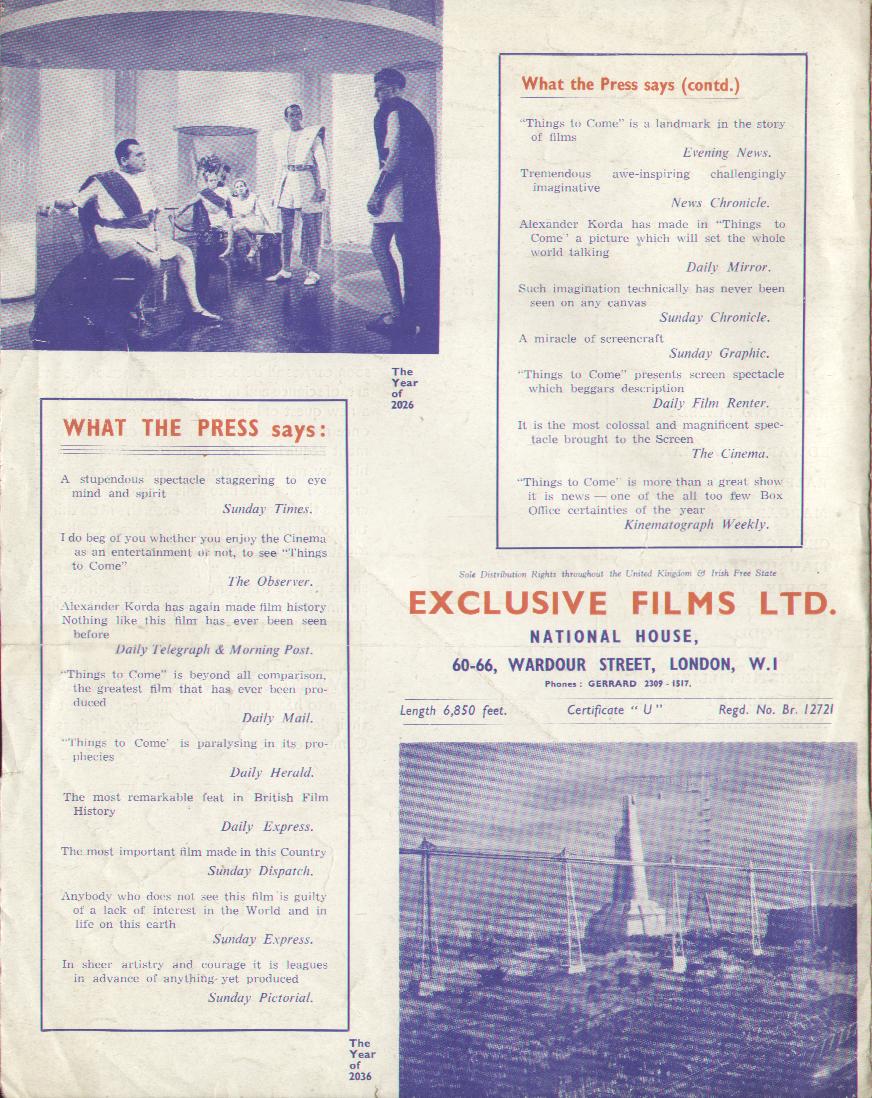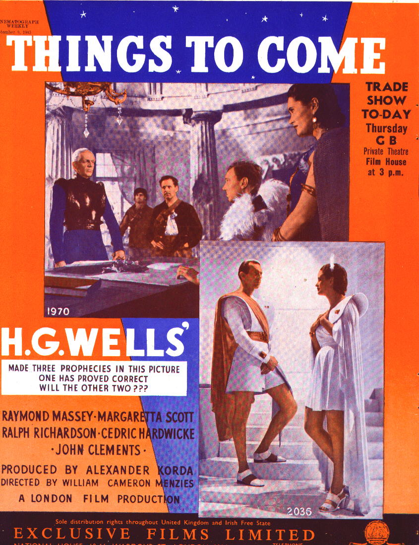 1943 Exclusive Films Re-Issue Trade AdvertAdvert from the industry magazine Kinematograph Weekly Thursday 9 September 1943 for a trade showing of Things to Come, re-issued by Exclusive Films, at a private cinema at 15.00 on the same date. These screenings were for the benefit of the cinema trade and the press, rather than the public. According to the British Board of Film Classification, the film as submitted was just 72m 13s long, and that after further cuts it was given a 'U' certificate on 16 September 1943. [Original in the author's collection]
