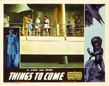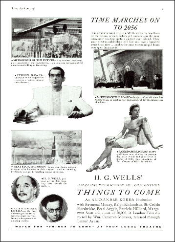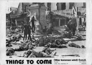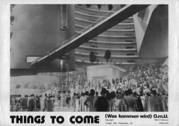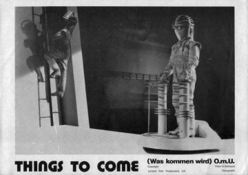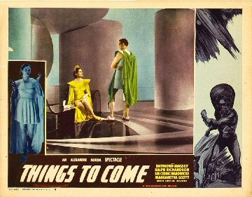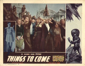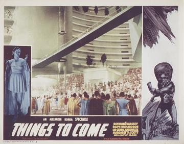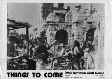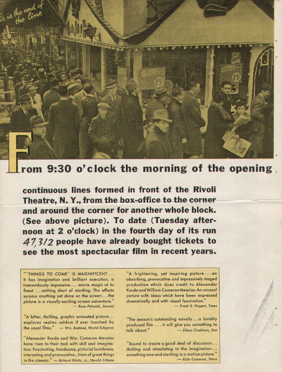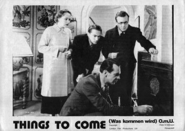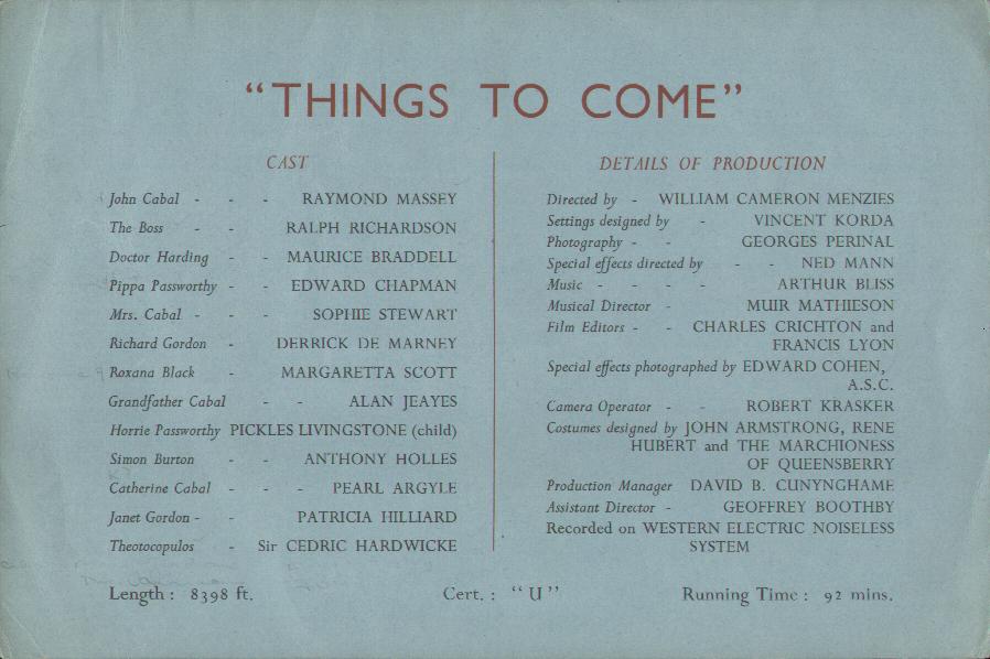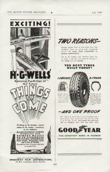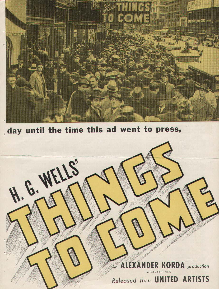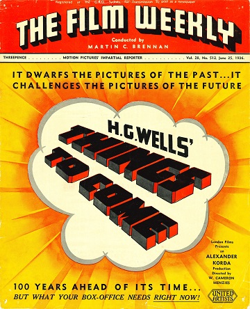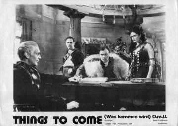1943 Exclusive Films Re-Issue Trade AdvertAdvert from the industry magazine Kinematograph Weekly Thursday 9 September 1943 for a trade showing of Things to Come, re-issued by Exclusive Films, at a private cinema at 15.00 on the same date. These screenings were for the benefit of the cinema trade and the press, rather than the public. According to the British Board of Film Classification, the film as submitted was just 72m 13s long, and that after further cuts it was given a 'U' certificate on 16 September 1943. [Original in the author's collection]