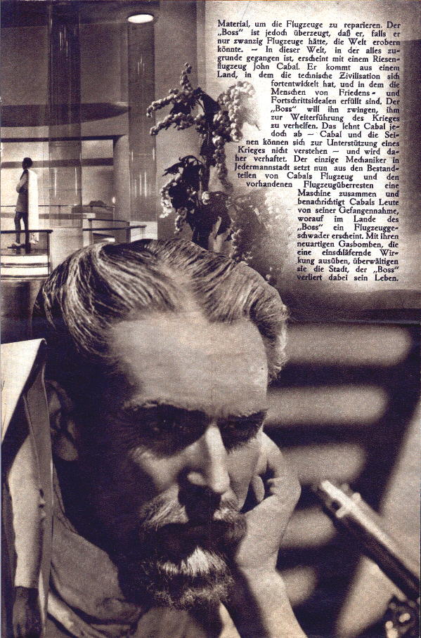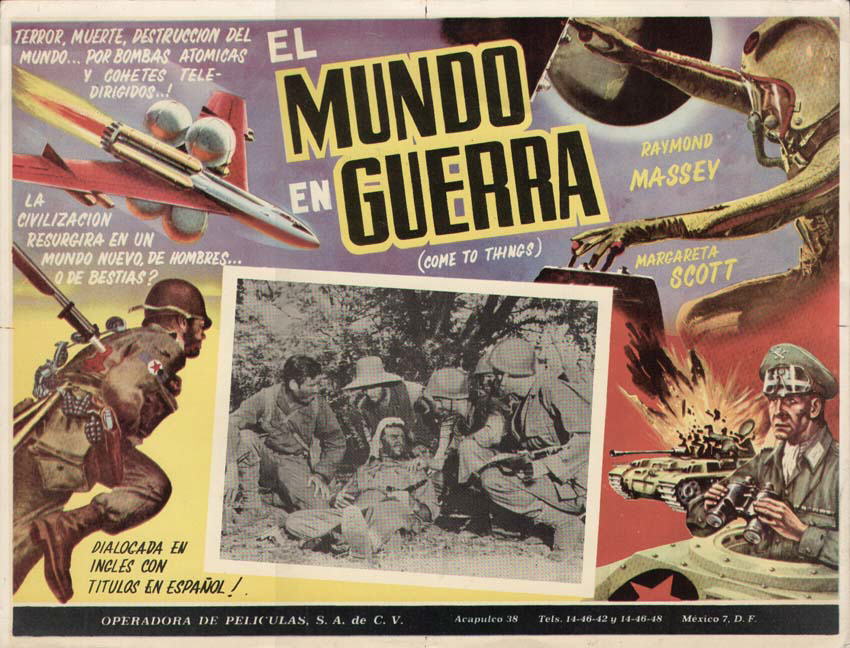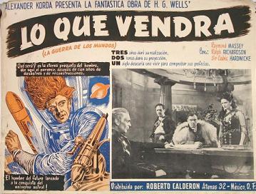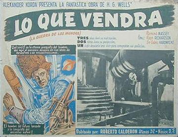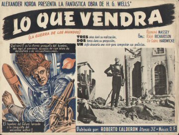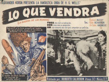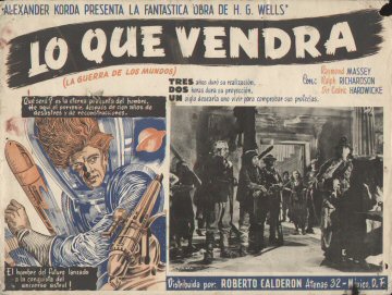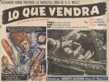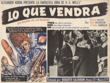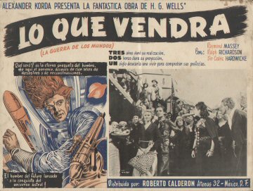 1947 Mexican Lobby CardsThree-colour 425 x 320mm cards, used to promote the film in Mexico in 1947. Notably, the second shown features the lost scene of Roxana arguing with the trader, Wadsky, while the sixth is the almost totally lost scene of Cabal alone in the "Detention Room" beneath the Boss's headquarters in the Town Hall. The title Lo Que Vendrá (La Guerra de Los Mundos) translates as "What Will Come (The War of the Worlds)," the latter part cheekily implying an adaptation of Wells's earlier novel.