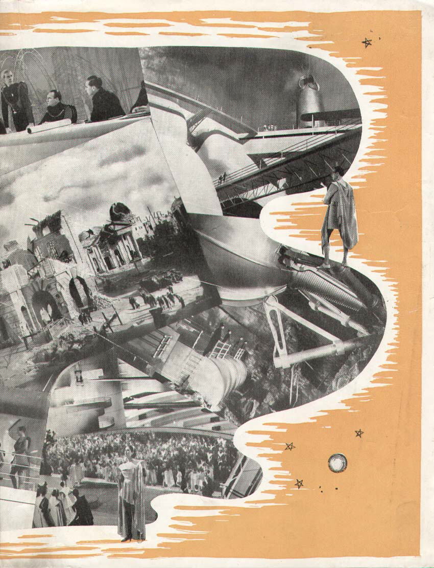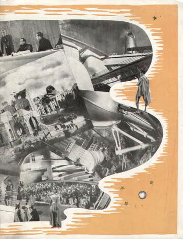 US Press BookThe 12" x 18" US Press Book - with its much-reproduced cover image - contained sample advertising and advice to cinema owners and managers on how to aggresively promote the film, either directly or by involving other local businesses: Local tie ups should literally fall into your lap; merchants who sell radios can tie in with your newspaper campaign by just lifting one of the ads from your ad section, which shows television of the future. Phew! Of course, it also makes the highly suspect claim that the scale of the production, "made necessary 3 years of actual filming," so obviously should be taken with a vat or two of salt.... [Cover only from incomplete original in the author's collection (formerly FJA collection)]