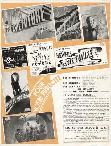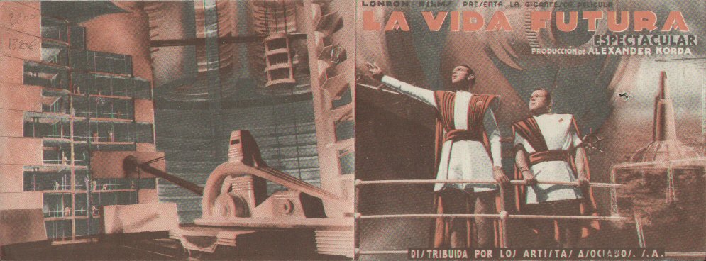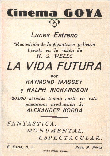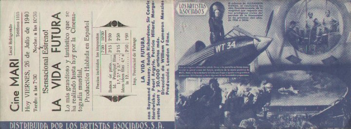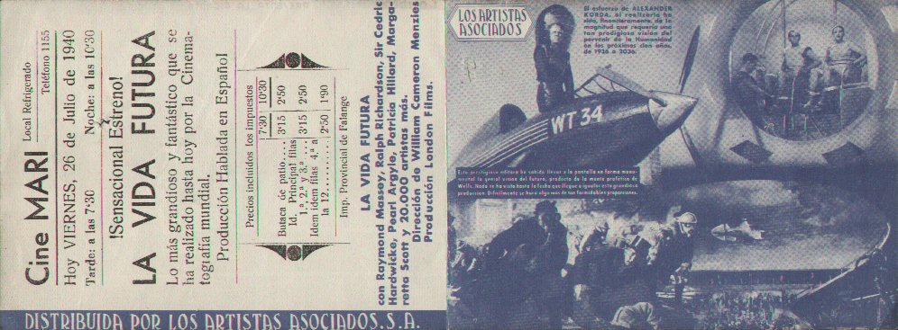 26 July 1940 Spanish HeraldSingle 253mm x 94mm sheet folded into a hand-bill or "herald" advertising Spanish-dubbed screenings of the film on 26 July 1940. In 1936 the country was still gripped by civil war, and so the film may not have been widely seen there at the time, if at all. The title La Vida Futura translates as "The Future Life." [Original in the author's collection]