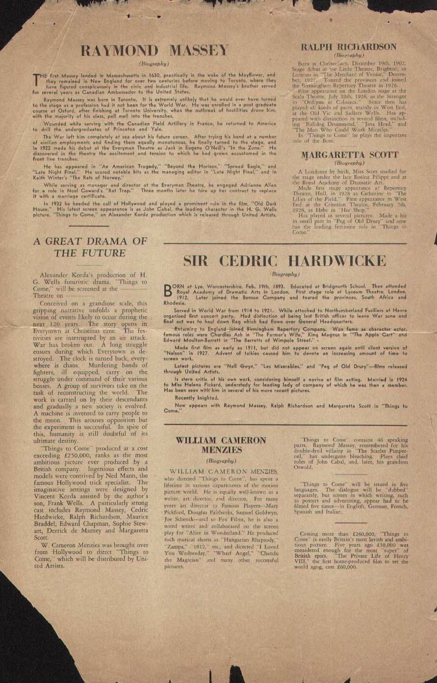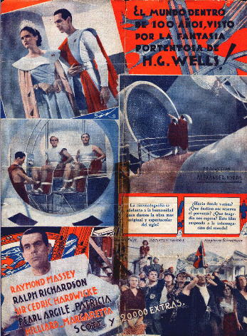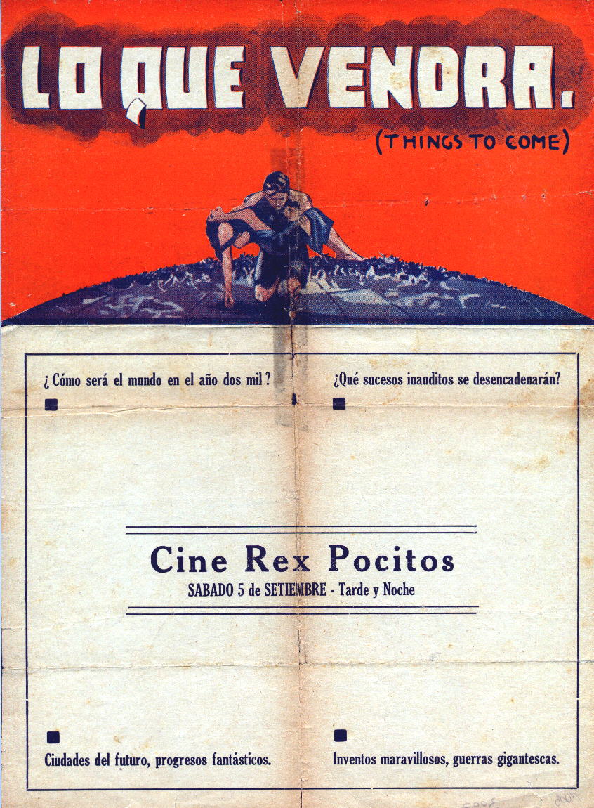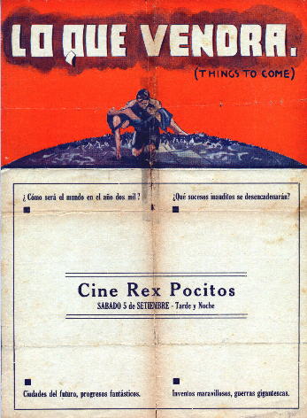 September 1936 (?) Uruguayan HeraldLarge 217mm x 296mm hand-bill or "herald" used to advertise a release of the film in Spanish-speaking Uruguay. Although the year is not given, 5th September 1936 did fall on a Saturday, which would match the stated screening day (a re-issue in 1942, 1953 or 1959 remains an unlikely possibility). The title "Lo Que Vendrá" translates as "What Will Come." [Original in the author's collection]