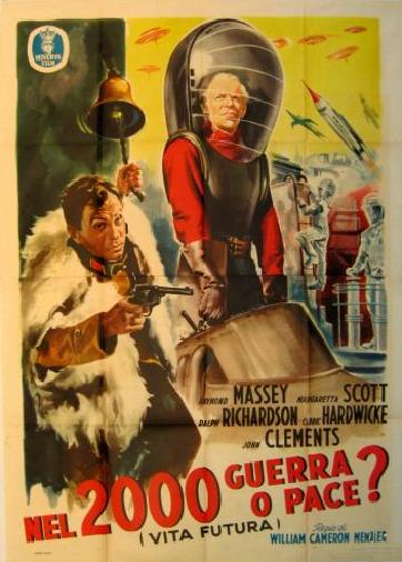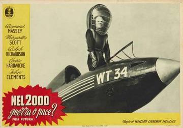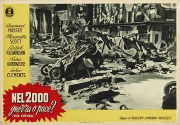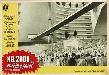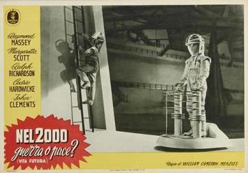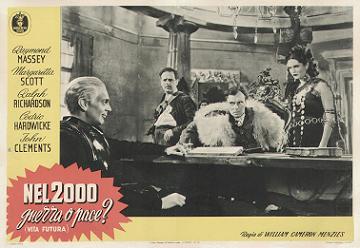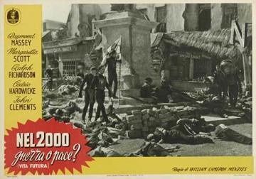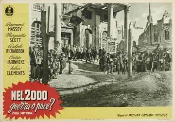 1953 Italian Minerva Film Lobby Cards493mm x 340mm three-colour lobby cards used to promote a re-issue by Minerva Film. When it was first released in 1936, the fascist dictator Benito Mussolini reputedly had every print of the film in Italy destroyed due to the extreme similarity between himself and Richard Richardson's portrayal of The Boss of Everytown. Again, John Clements's billing has been raised by the passage of time. They are dated 2 March 1953, and the title Nel 2000 Guerra o Pace? (Vita Futura) translates as In 2000 War or Peace? (Future Life). [Third example is a hand-restored and linen-backed original in the author's collection]