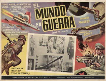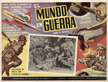 Later Mexican Lobby CardsMulti-coloured 429mm x 330mm cards (17" x 12"), apparently used to promote a post-War/1950s re-issue - in English with Spanish sub-titles - of the film in Mexico. Impressive though they seem, the bulk of the artwork has no connection with the original film, which is truly represented only by the use of an apparently random montage of publicity stills in the centre of the first seen here! Other known examples have different b/w stills, some if not all of which - as can be seen from the second - are from completely different films! The title El Mundo En Guerra translates as "The World at War." [Selected examples of originals in the author's collection]